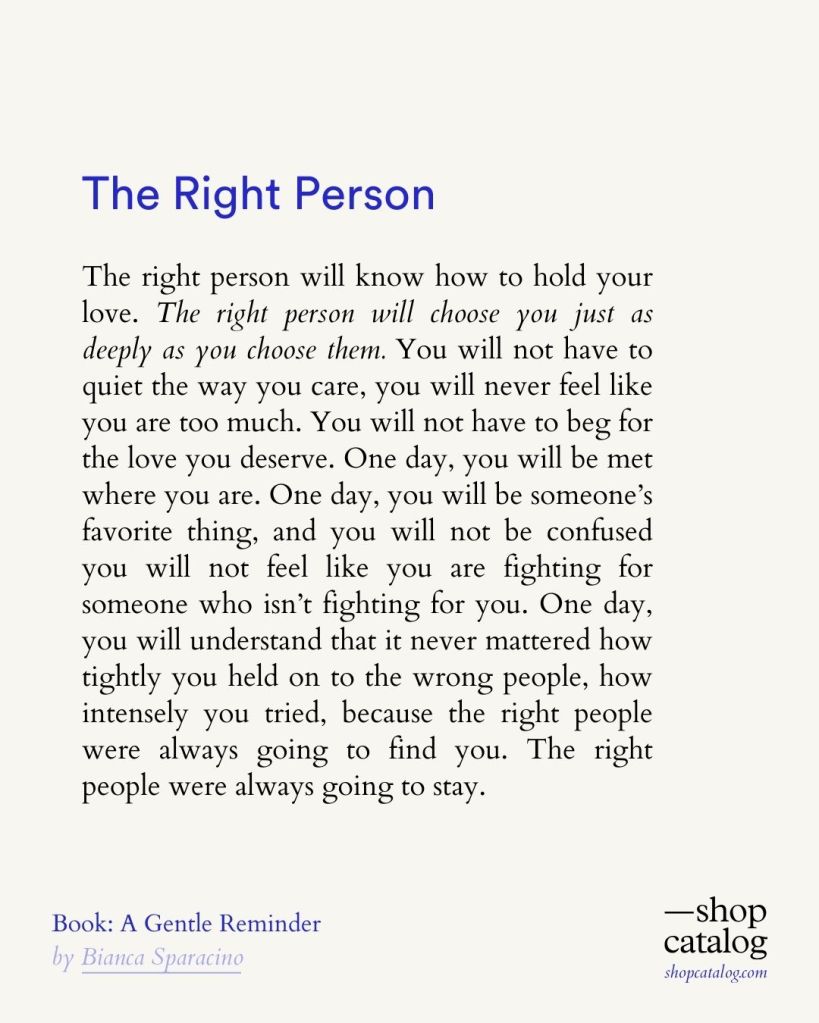 The right person will choose you just as deeply as you choose them. You will not have to quiet the way you care, you will never feel like you are too much. You will not have to beg for the love you deserve.