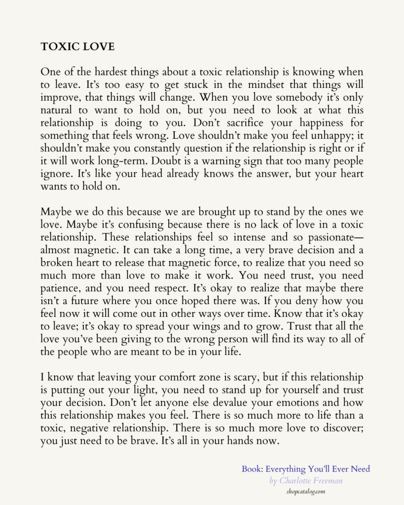 Maybe it’s confusing because there is no lack of love in a toxic relationship. These relationships feel so intense and so passionate—almost magnetic. It can take a long time, a very brave decision and a broken heart to release that magnetic force, to realize that you need so much more than love to make it work. You need trust, you need patience, and you need respect. It’s okay to realize that maybe there isn’t a future where you once hoped there was. If you deny how you feel now it will come out in other ways over time. Know that it’s okay to leave; it’s okay to spread your wings and to grow. Trust that all the love you’ve been giving to the wrong person will find its way to all of the people who are meant to be in your life.